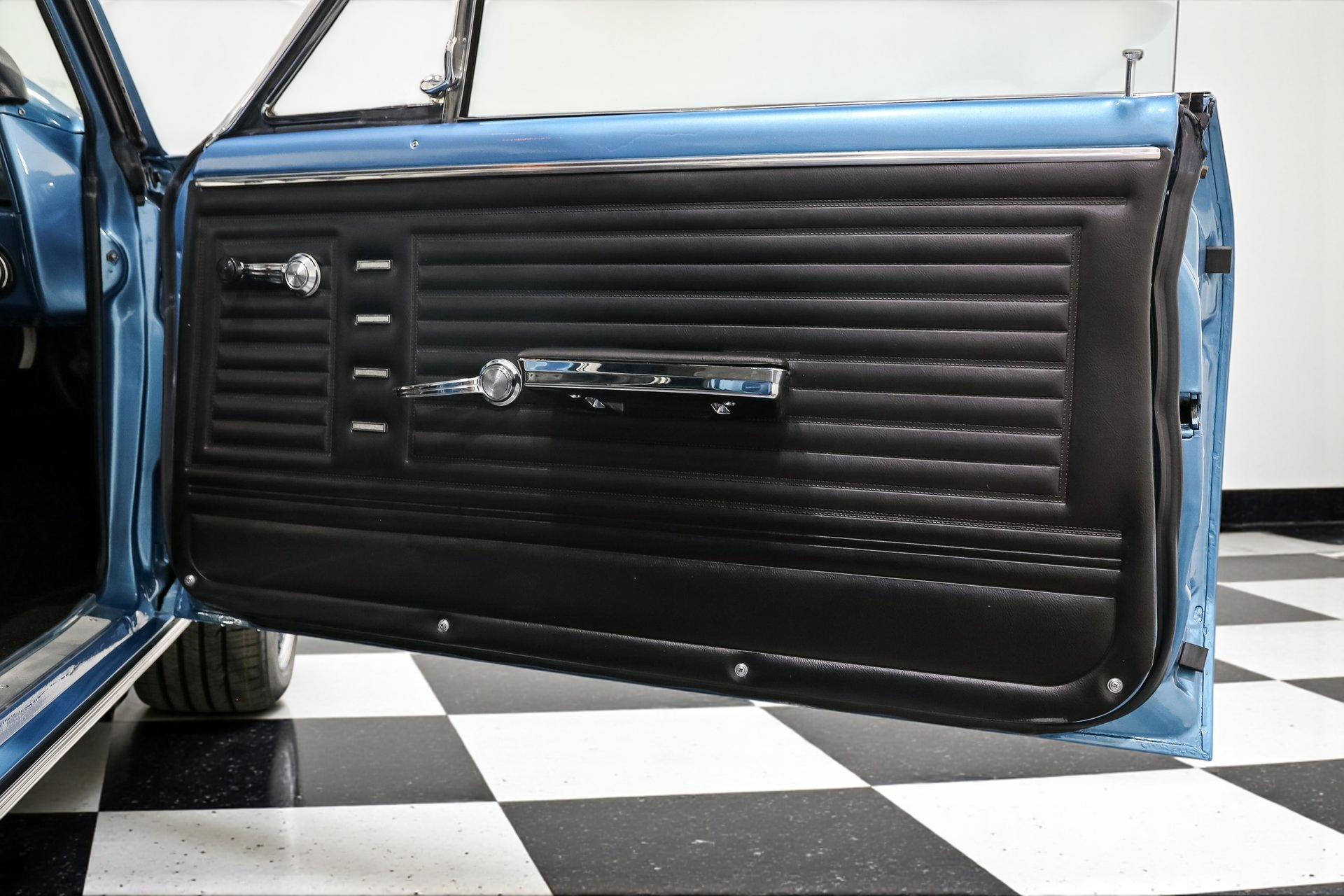 The exterior's blue hue is beautifully contrasted by a sleek black vinyl top, a nod to the car's heritage and style. Inside, the cabin is a testament to thoughtful preservation and enhancement, from the retro radio that hints at nostalgia without sacrificing modern sound, to the Eddie Motorsports billet aluminum hood hinges, every detail has been curated to celebrate the Chevelle's legacy while propelling it into the present.