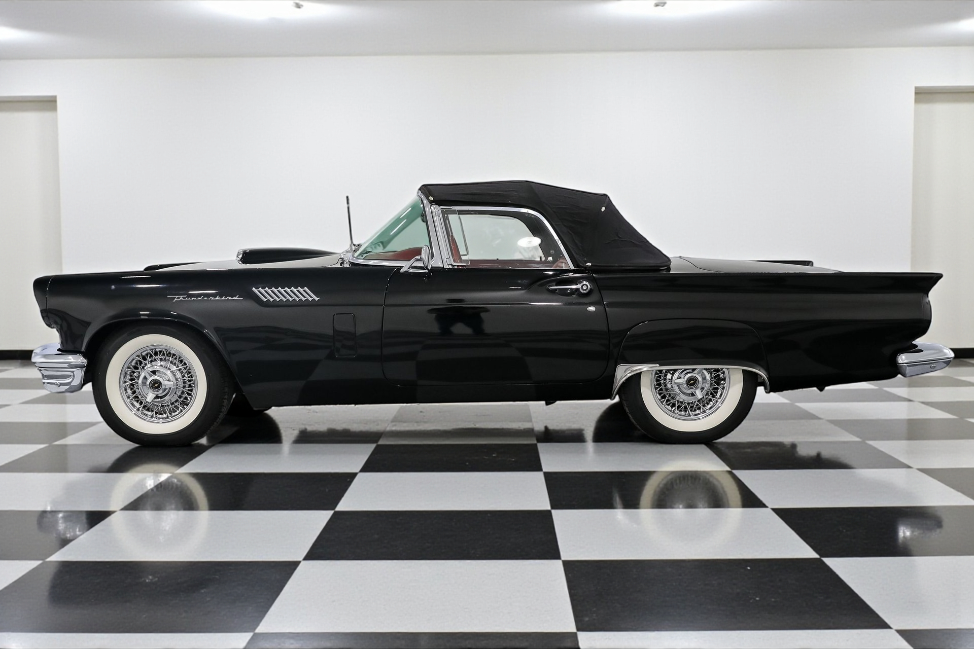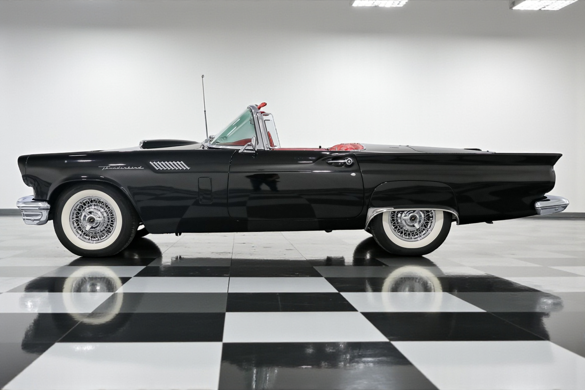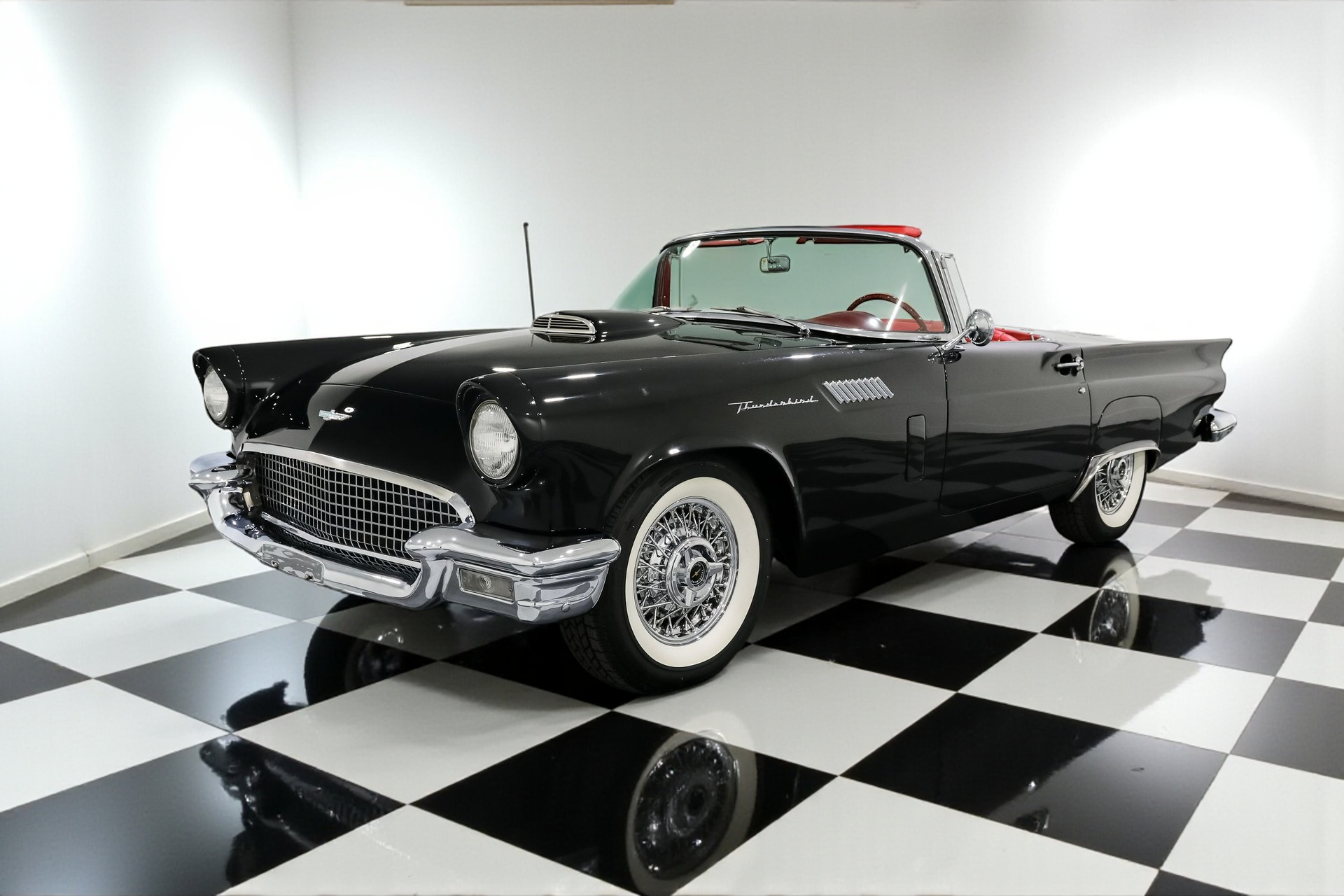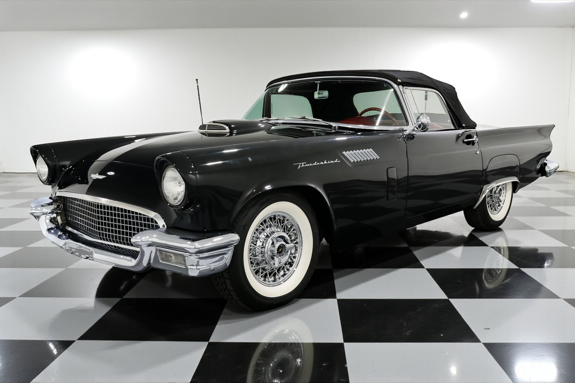 Dressed to impress in sleek black paired with a vibrant red interior, this Thunderbird captures the spirit of its era perfectly, blending iconic design with the thrill of open-air driving.