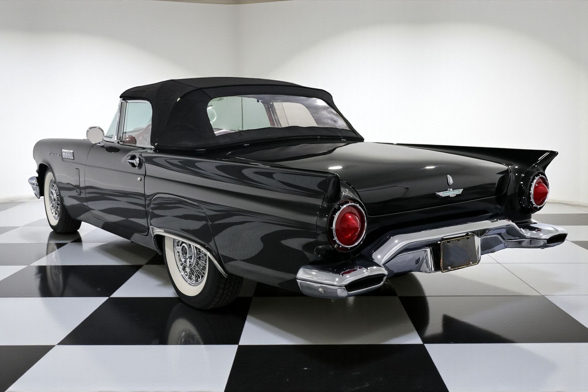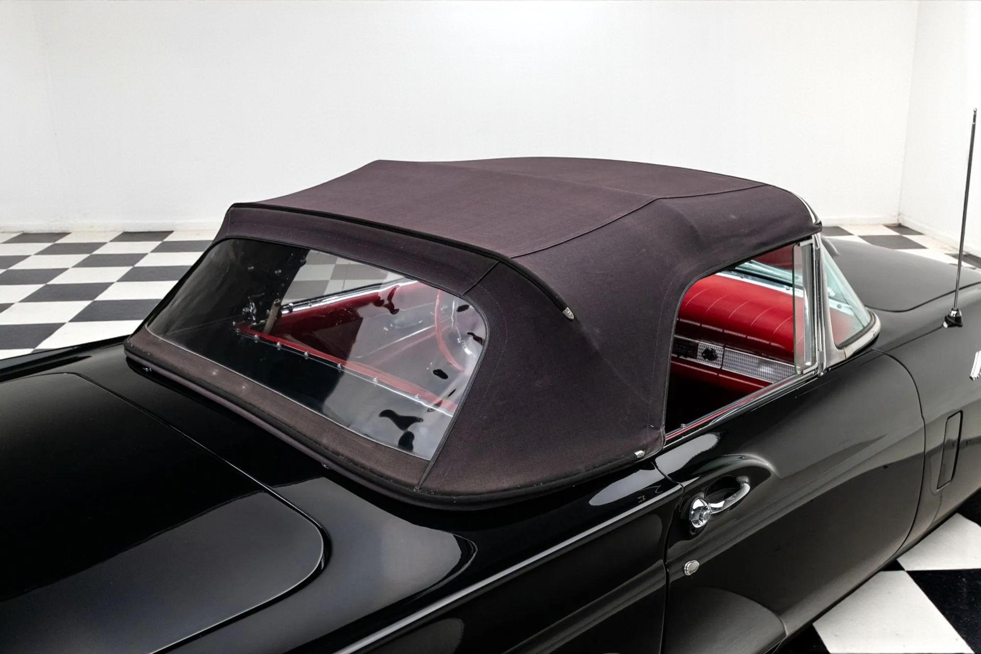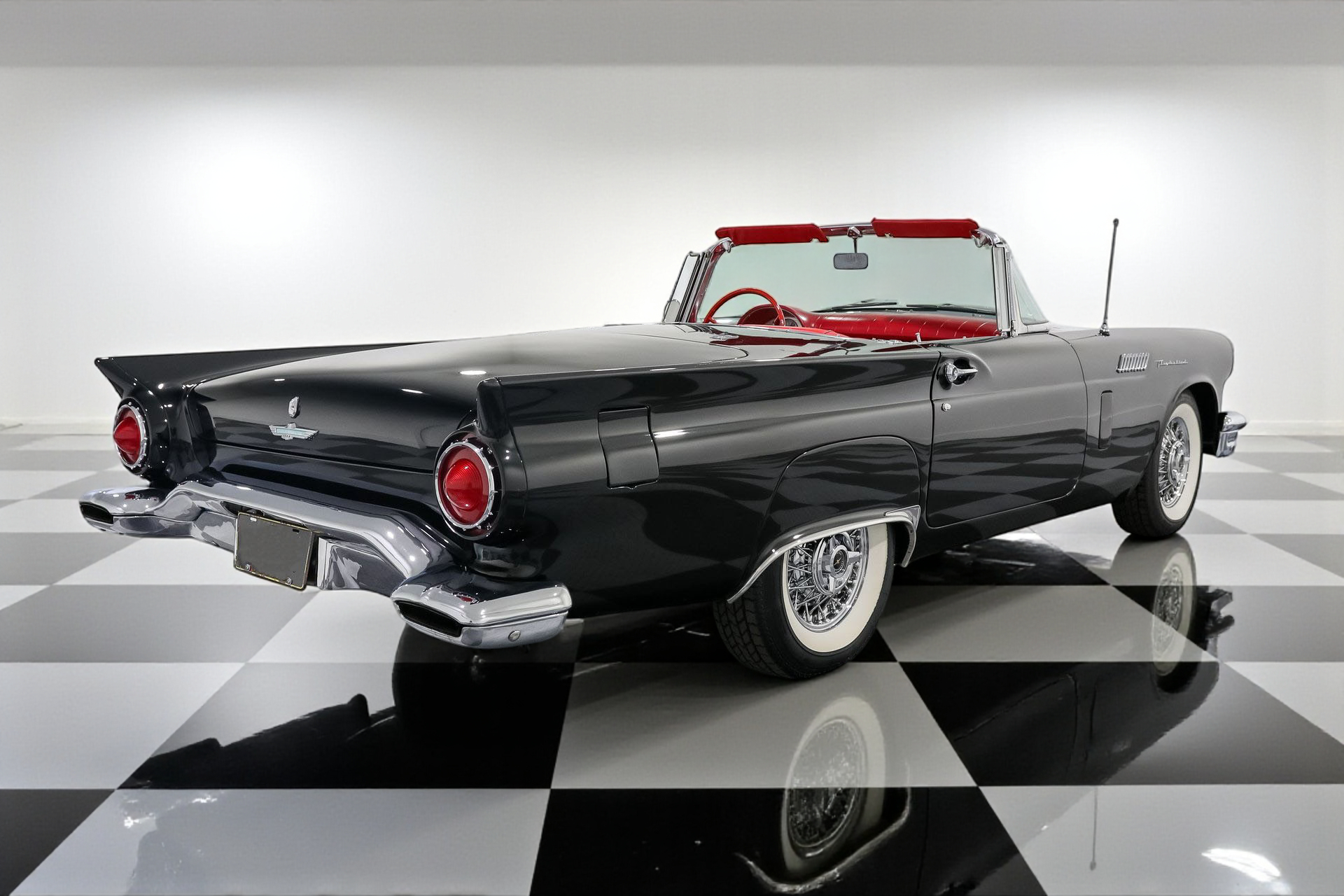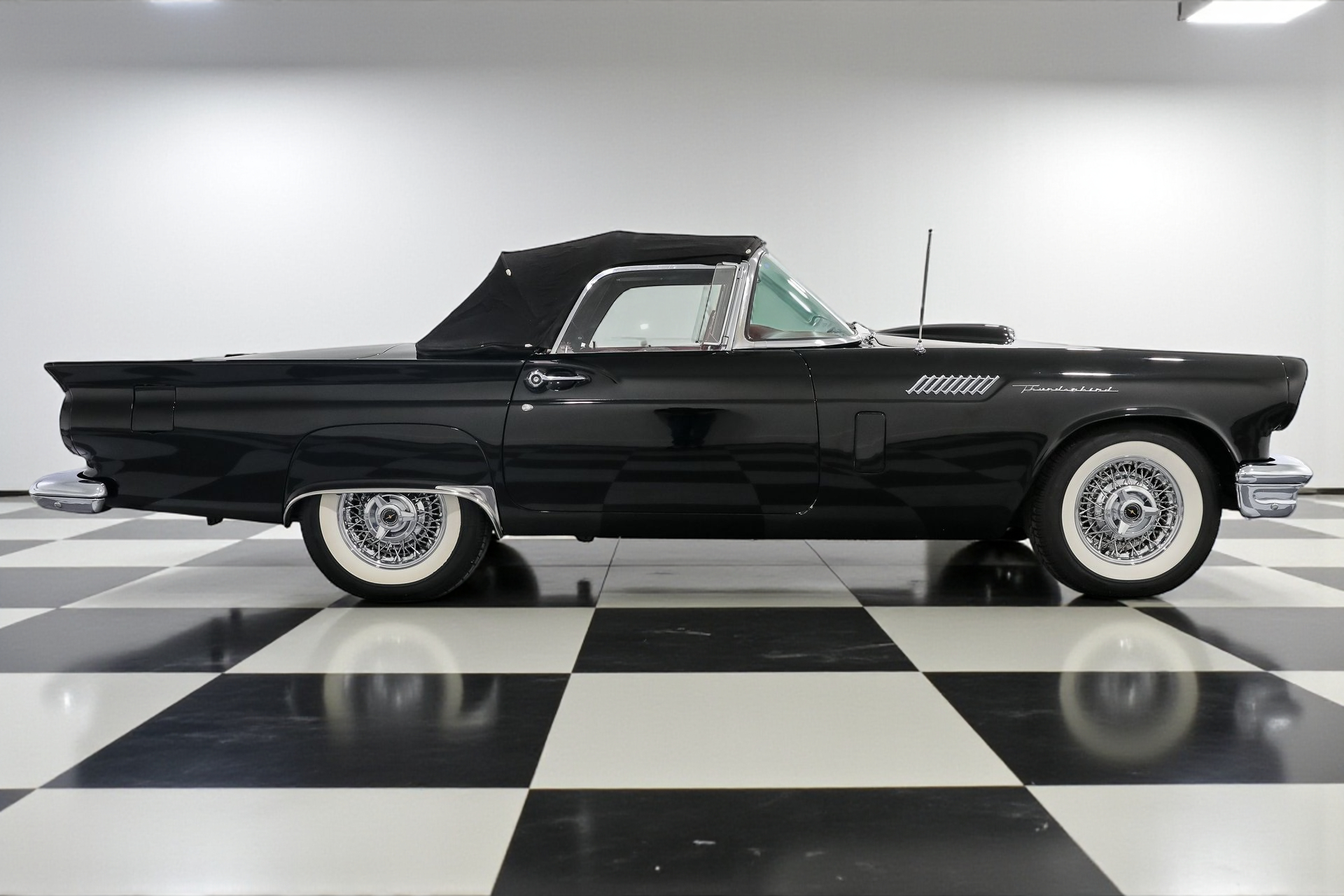 Dressed to impress in sleek black paired with a vibrant red interior, this Thunderbird captures the spirit of its era perfectly, blending iconic design with the thrill of open-air driving.