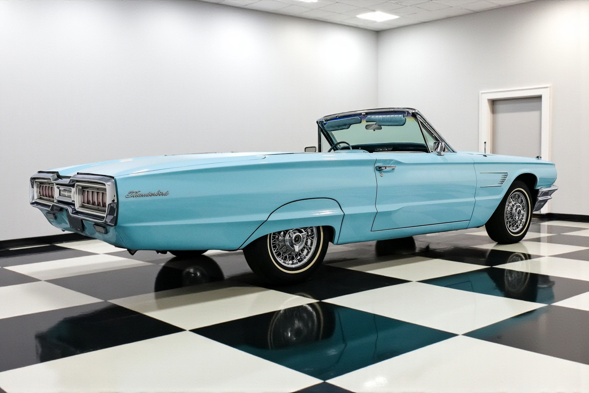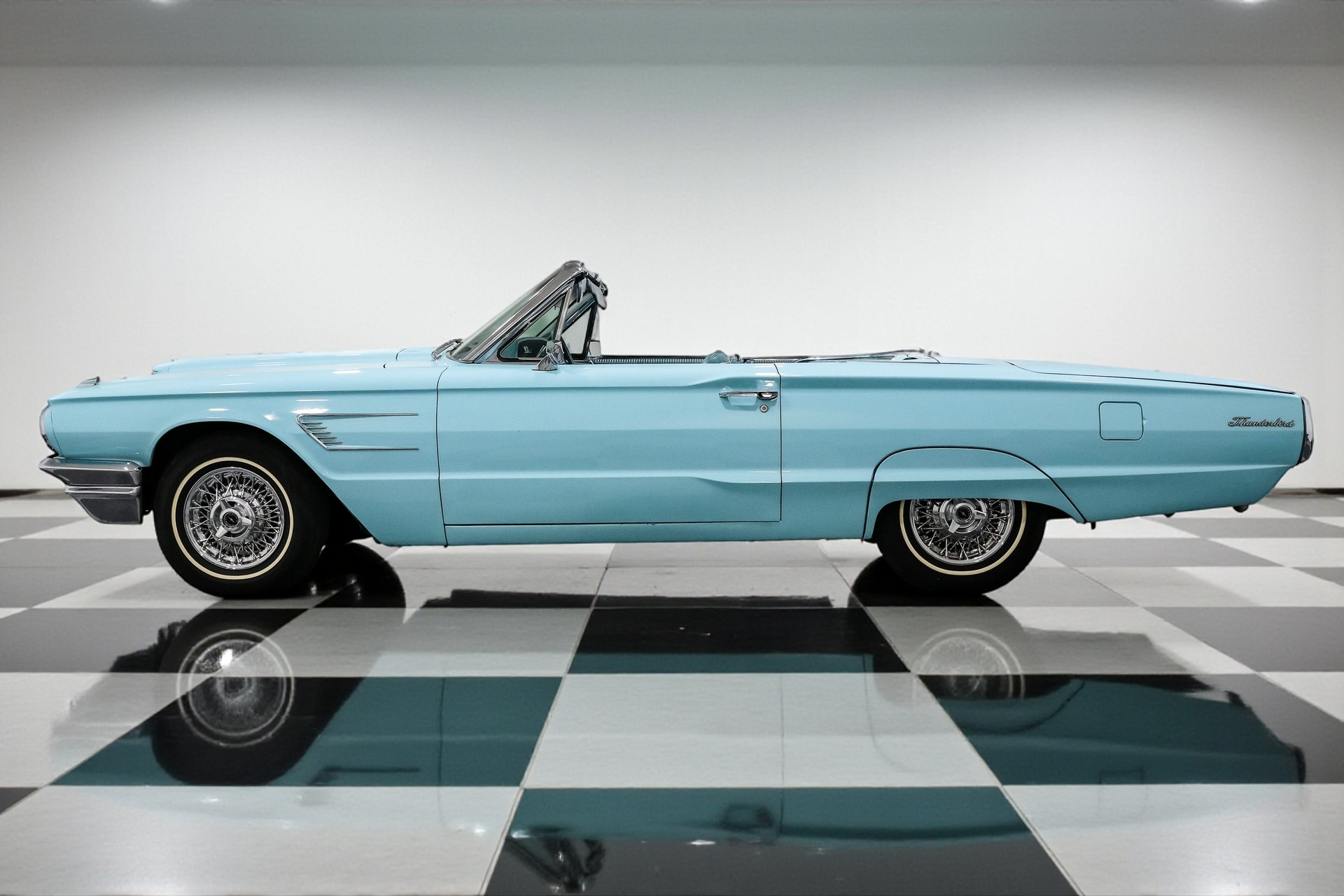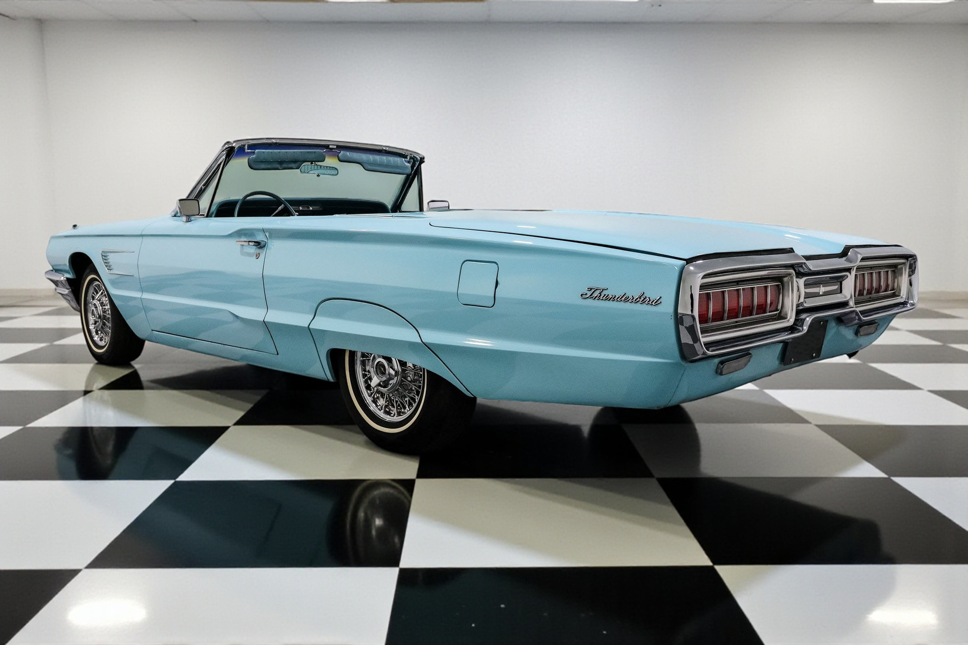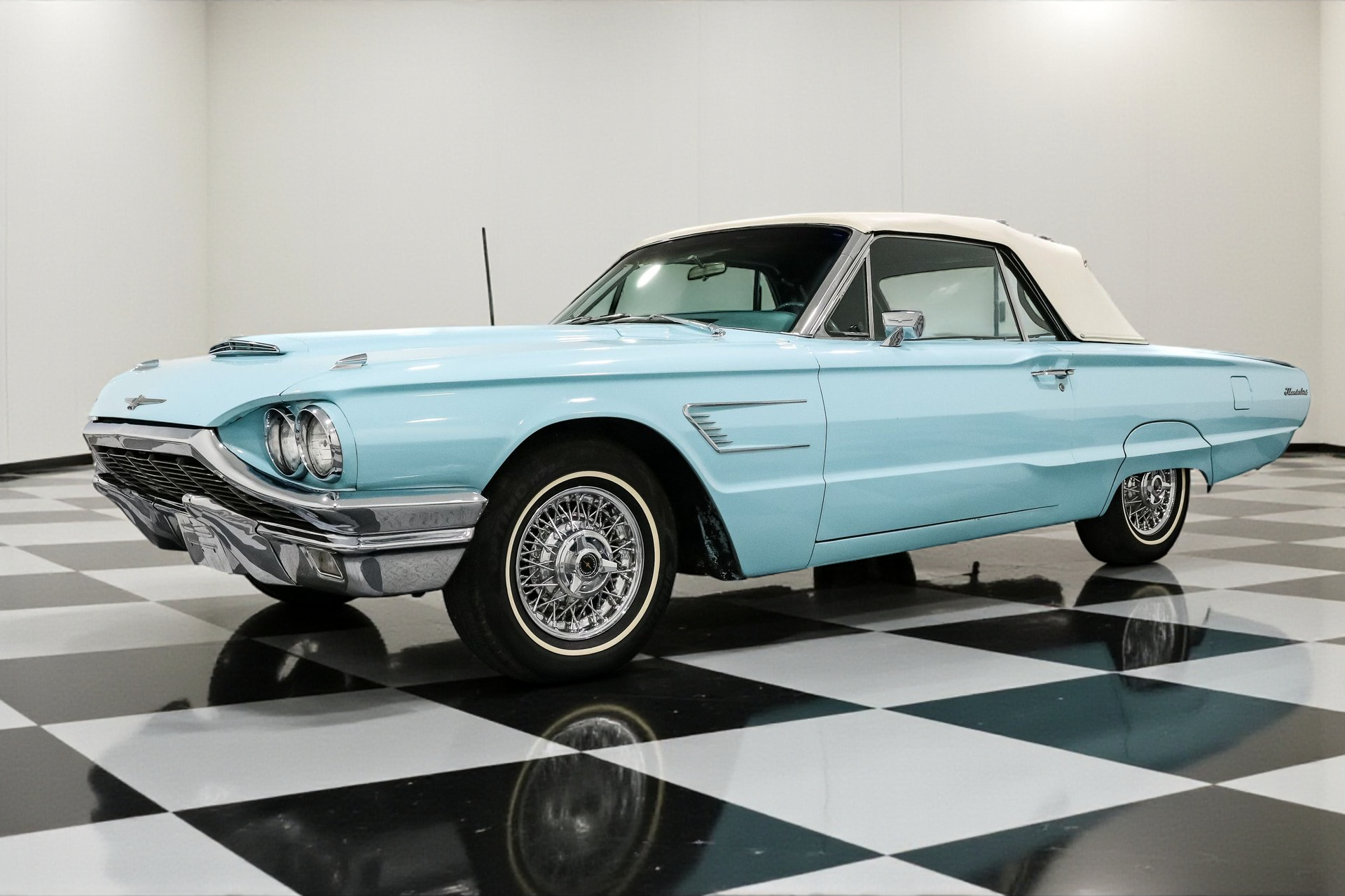 Finished in an eye-popping shade of turquoise, the body is long, low, and accented by signature fender skirts and gleaming 15-inch factory Thunderbird true spoke wheels. This thing doesn't just roll, it floats with authority. A power convertible top completes the look, making every drive an open-air event worth remembering.