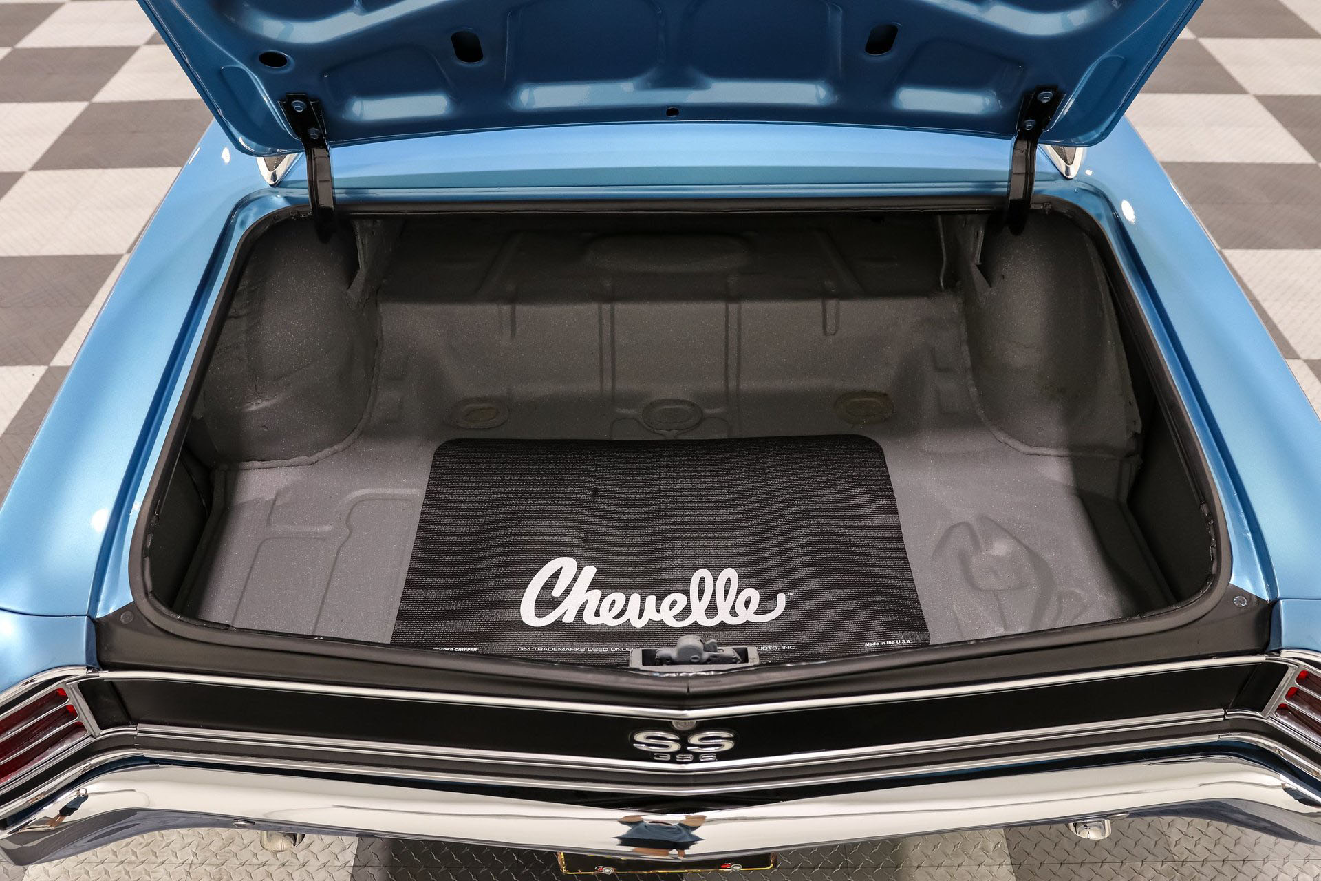 The exterior's blue hue is beautifully contrasted by a sleek black vinyl top, a nod to the car's heritage and style. Inside, the cabin is a testament to thoughtful preservation and enhancement, from the retro radio that hints at nostalgia without sacrificing modern sound, to the Eddie Motorsports billet aluminum hood hinges, every detail has been curated to celebrate the Chevelle's legacy while propelling it into the present.
