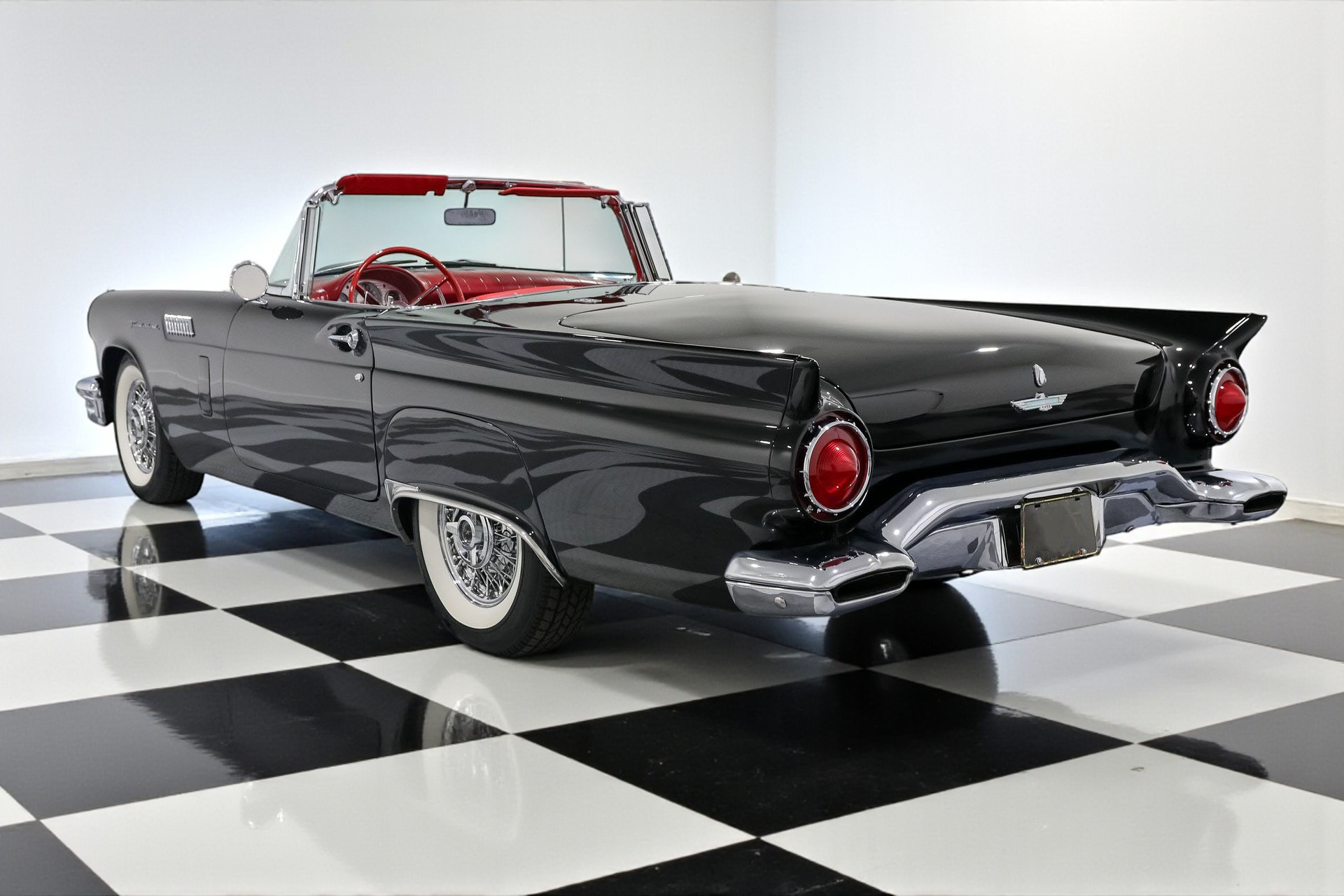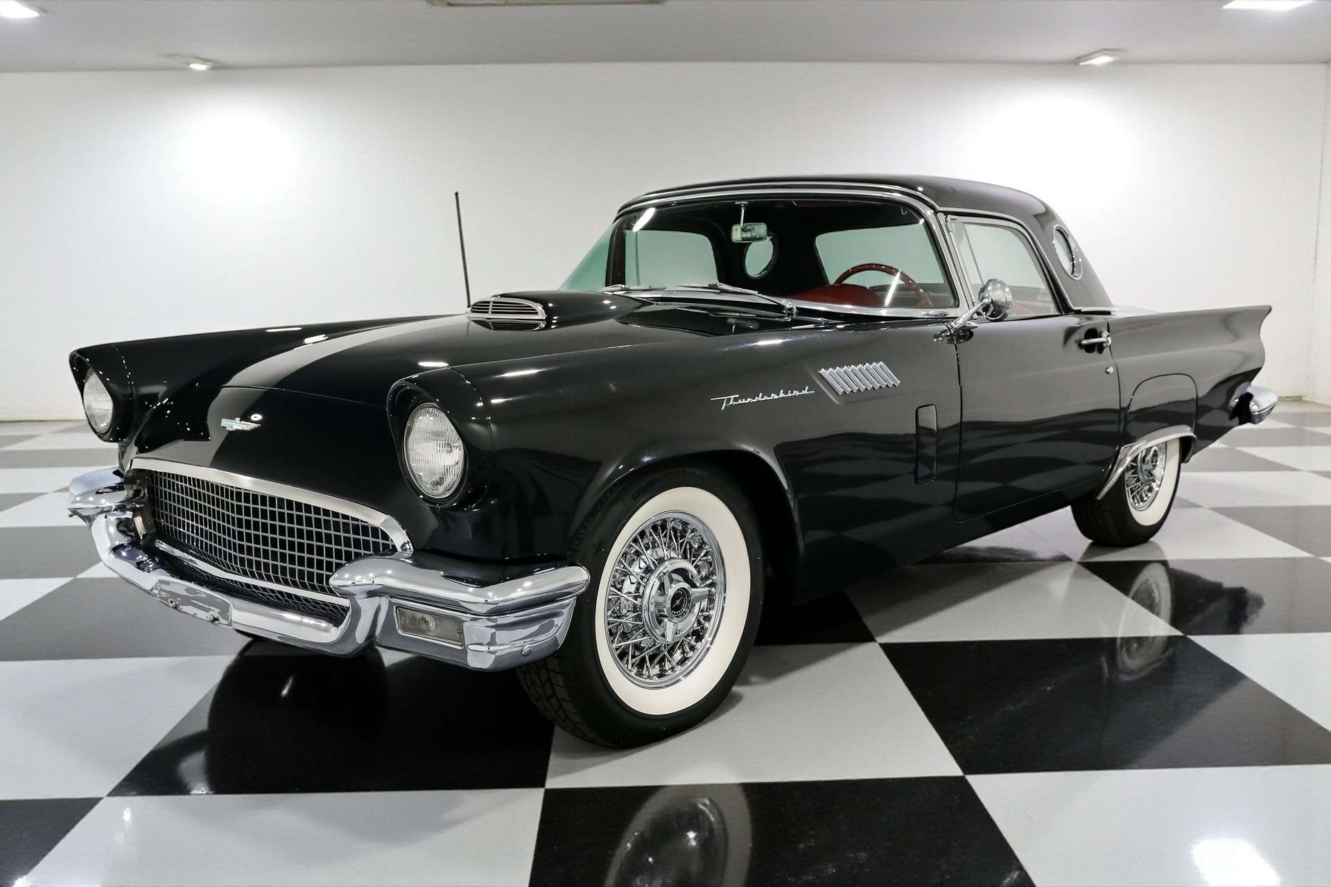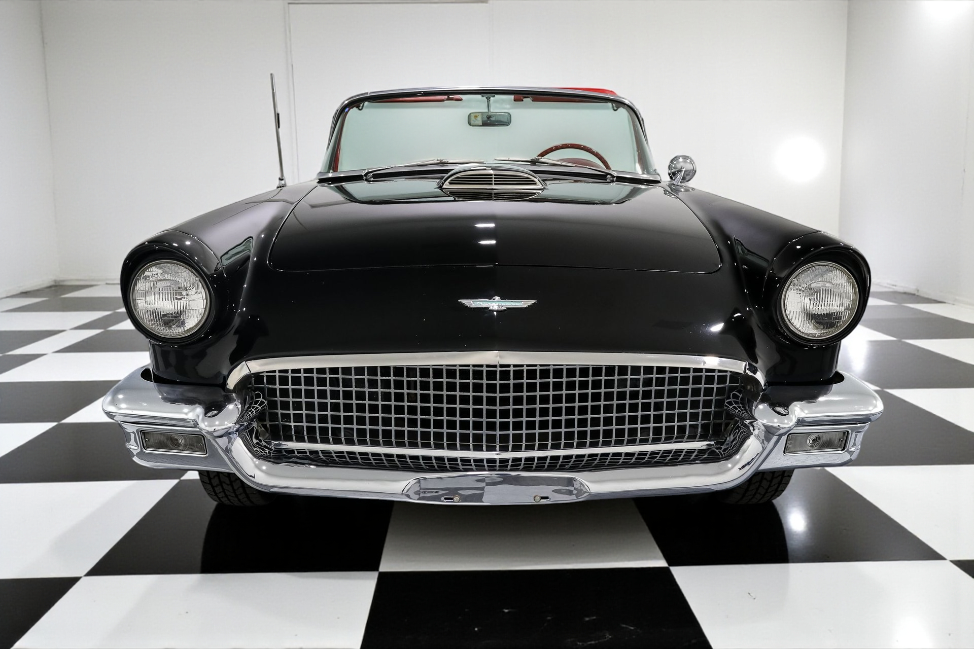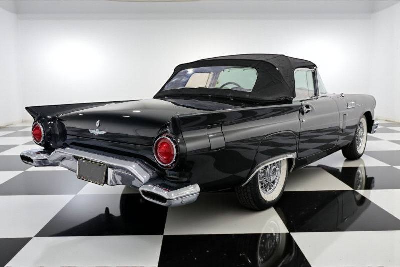 Dressed to impress in sleek black paired with a vibrant red interior, this Thunderbird captures the spirit of its era perfectly, blending iconic design with the thrill of open-air driving.
