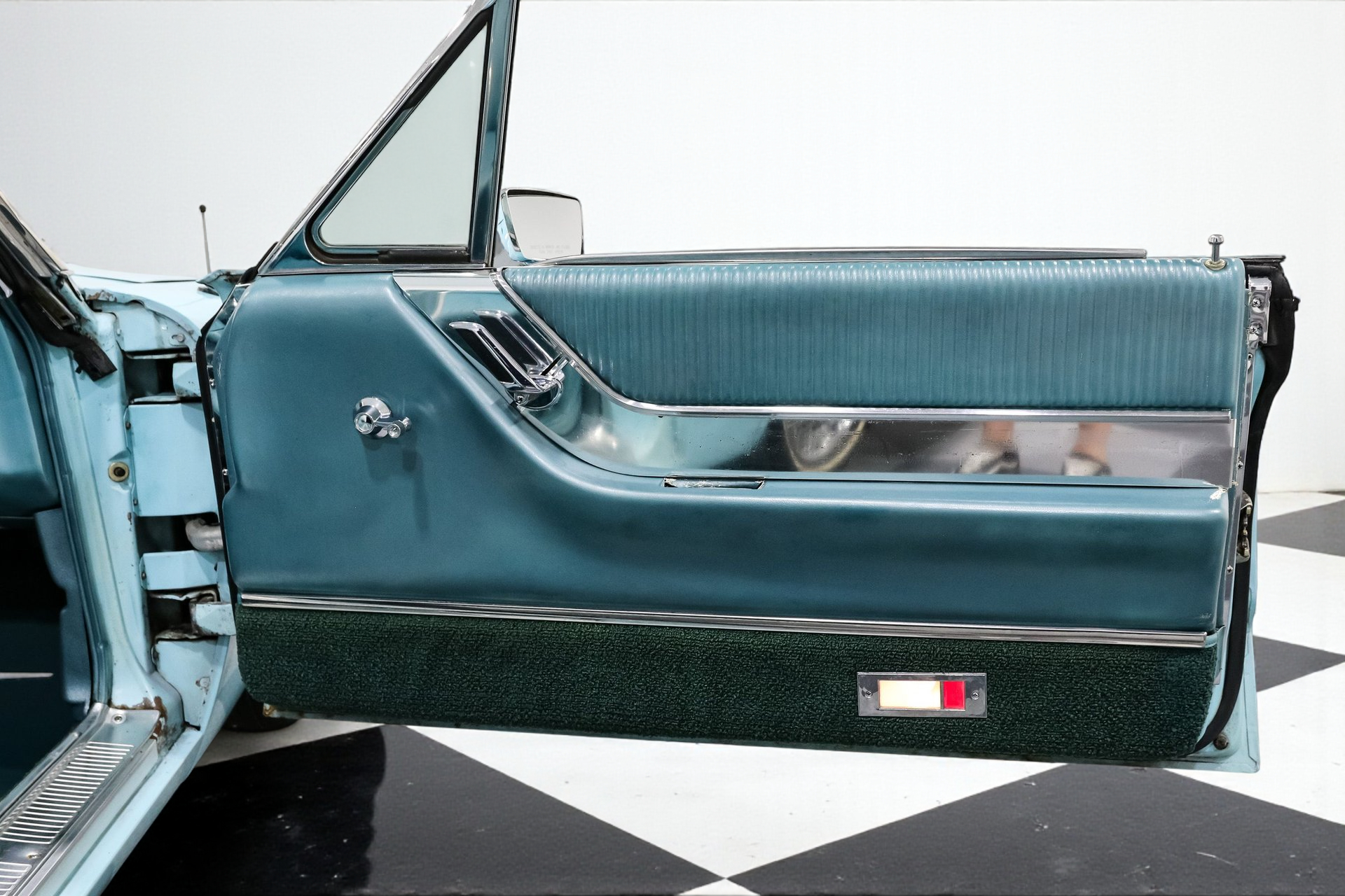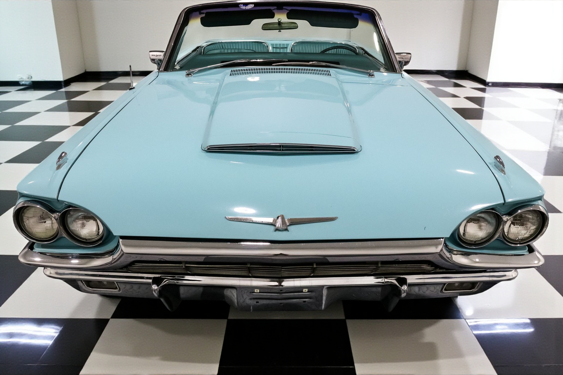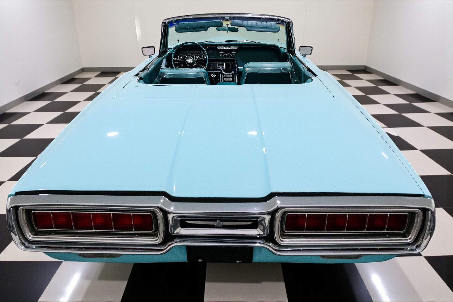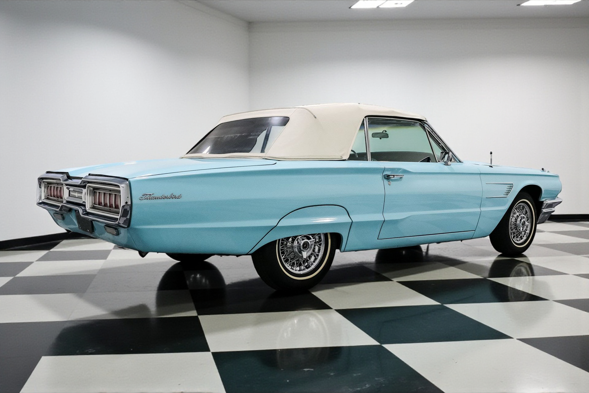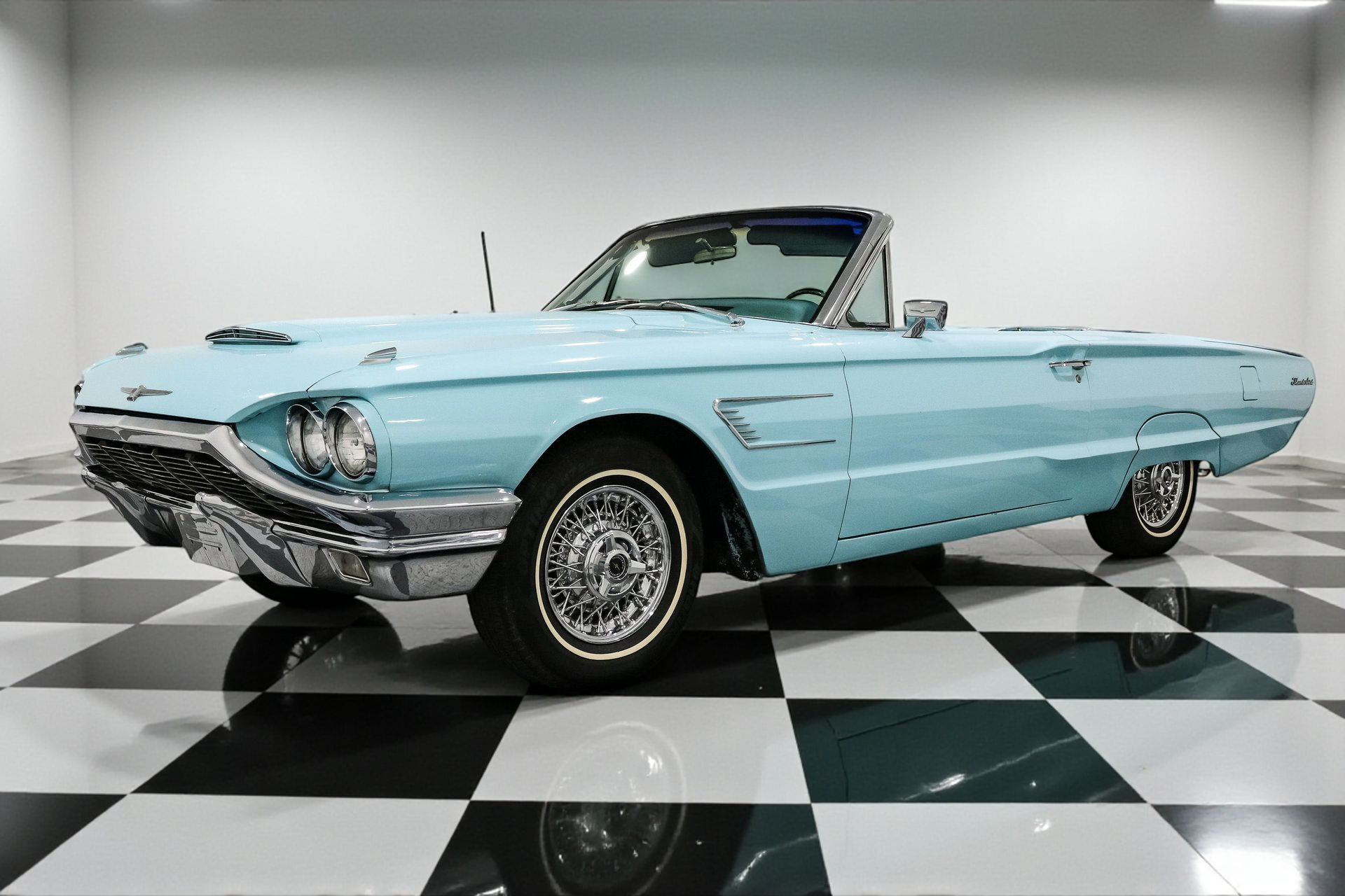 Finished in an eye-popping shade of turquoise, the body is long, low, and accented by signature fender skirts and gleaming 15-inch factory Thunderbird true spoke wheels. This thing doesn't just roll, it floats with authority. A power convertible top completes the look, making every drive an open-air event worth remembering.